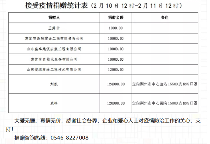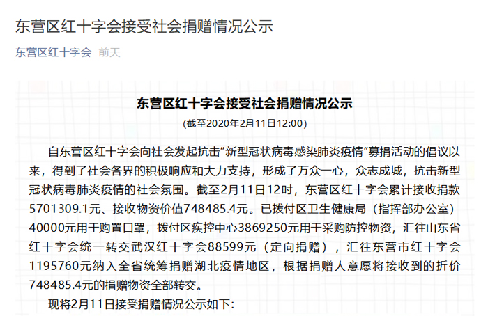 ▲2月3日東營市紅十字會抗擊新型肺炎募捐統(tǒng)計(jì)公示