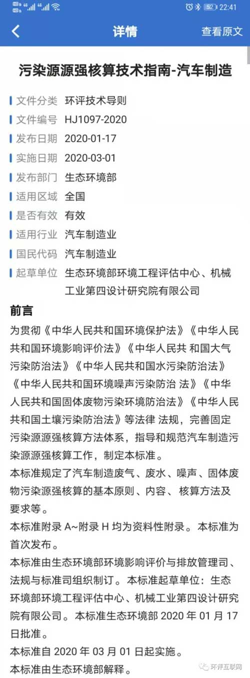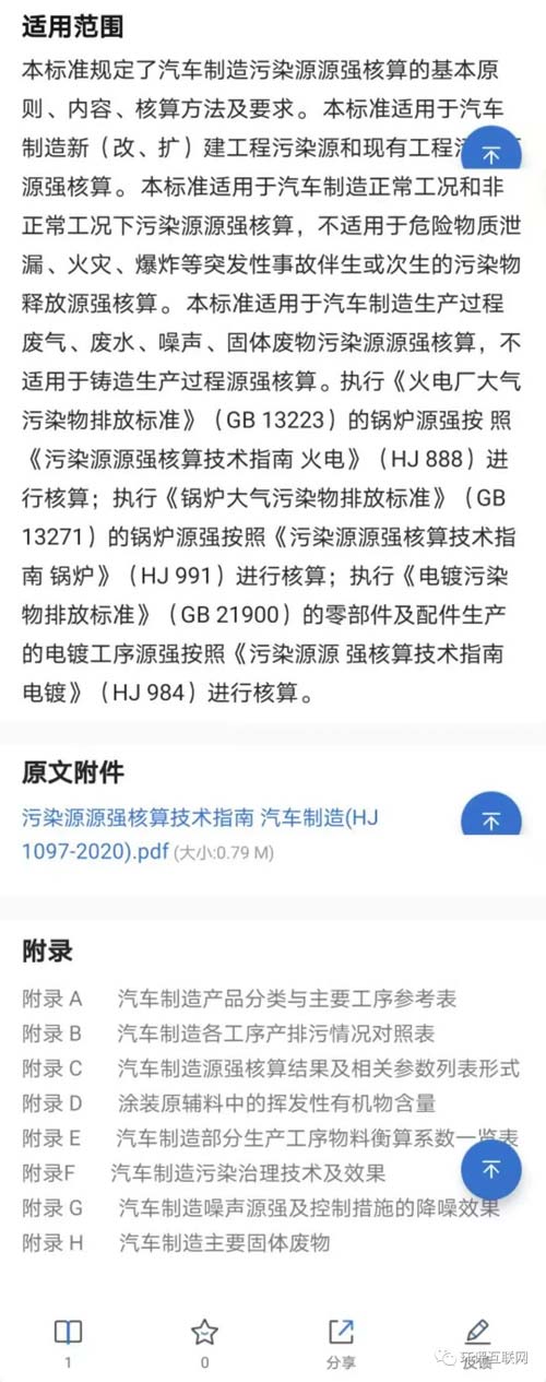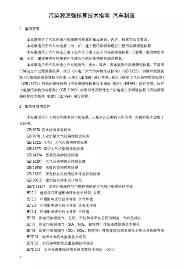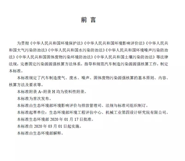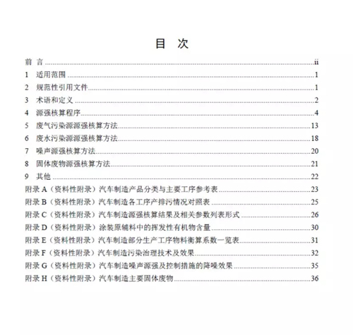 本標準規定了汽車制造廢氣、廢水、噪聲、固體廢物污染源強核算的基本原則、內容、核算方法及要求等。本標準附錄 A~附錄 H 均為資料性附錄。本標準為首次發布。