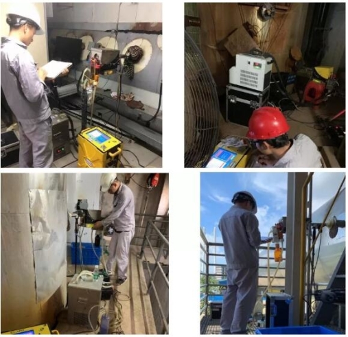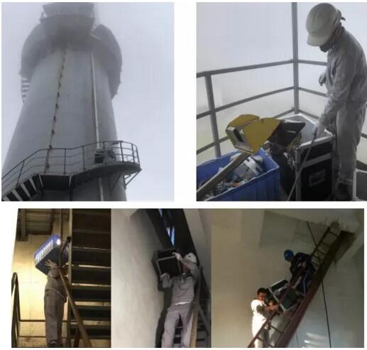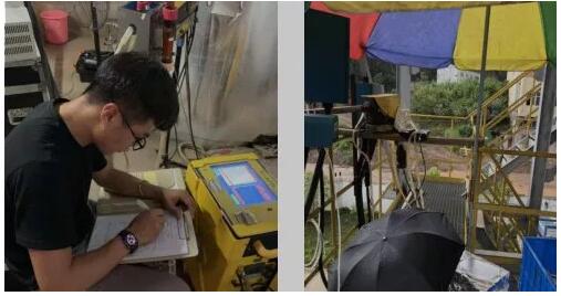 雖然已入秋,但南方此時正值高溫高濕、時雨時晴的臺風天氣。晨光熹微,采樣人員整裝出發(fā),分組“空降”到計劃監(jiān)測的生活垃圾焚燒廠。遇到現場無升降設備時,采樣人員手抬、肩扛將重達幾十公斤的采樣設備搬運至30多米高的監(jiān)測平臺,在近45℃高溫的環(huán)境下堅守7個多小時進行監(jiān)測。采樣過程中考驗他們的是超過60度的斜梯,半只腳掌寬的臺階,空間逼仄的通道,讓人喘不過氣的高溫,但采樣人員常常打趣的給自己解壓,“肩上的擔子很重、腳下的腳印很深”。一天下來,個個大汗淋漓、衣衫濕透,但他們攜帶的風扇第一時間是給儀器降溫,防止設備“中暑”。